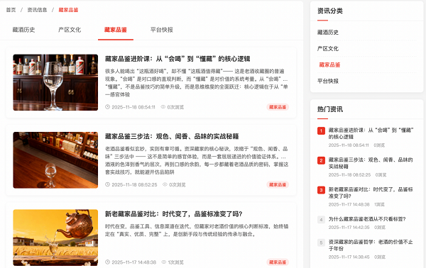 相较于传统线下渠道,藏酒电子商务平台解决了三大核心痛点:真伪难辨:平台建立区块链溯源体系,每瓶藏酒从生产、仓储到交易全程可查,搭配权威专家鉴定,杜绝假货;渠道有限:打破地域限制,汇聚全国优质藏酒资源,从茅台、五粮液等头部品牌稀缺年份酒,到地方特色典藏酒,一站式覆盖;交易不便:全端口同步运营,电脑端支持批量采购,手机端、小程序端实现即时下单,微信端依托社交生态方便快捷分享,满足多种场景需求。
